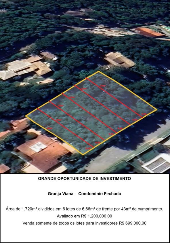 DescriçãoLote medindo 40m² de frente por 43m³ de fundo, podendo fazer o desdobro da area em 6 lotes de 6,33m² por 43m². Este condomínio é verdadeiramente emblemático em seu estilo rústico, capturando perfeitamente a atmosfera bucólica tão característica da região da Granja Viana. Aqui, a natureza exuberante e o charme interiorano se fundem harmoniosamente. A iluminação é abundante em todos os cantos, enquanto a portaria oferece um sistema de controle de acesso seguro e eficiente. Os terrenos, variando entre 700 e 2.000 m², abrigam residências de excelente padrão, criando um ambiente onde qualidade de vida e sofisticação se encontram em perfeita sintonia. Não perca a oportunidade de vivenciar a beleza e o conforto deste condomínio pessoalmente. Agende agora mesmo a sua visita para conhecer de perto este incrível terreno. uma região que combina tranquilidade e segurança, tudo pertinho de São Paulo, com vários acessos as principais rodovias: Raposo Tavares, Castelo Branco, Regis Bitencourt e Rodoanel Mario Covas, além de vários comércios como escolas públicas e particulares, Atacadista Assai, vários restaurantes de diversos gostos, rede de farmácias e postos de combustíveis.